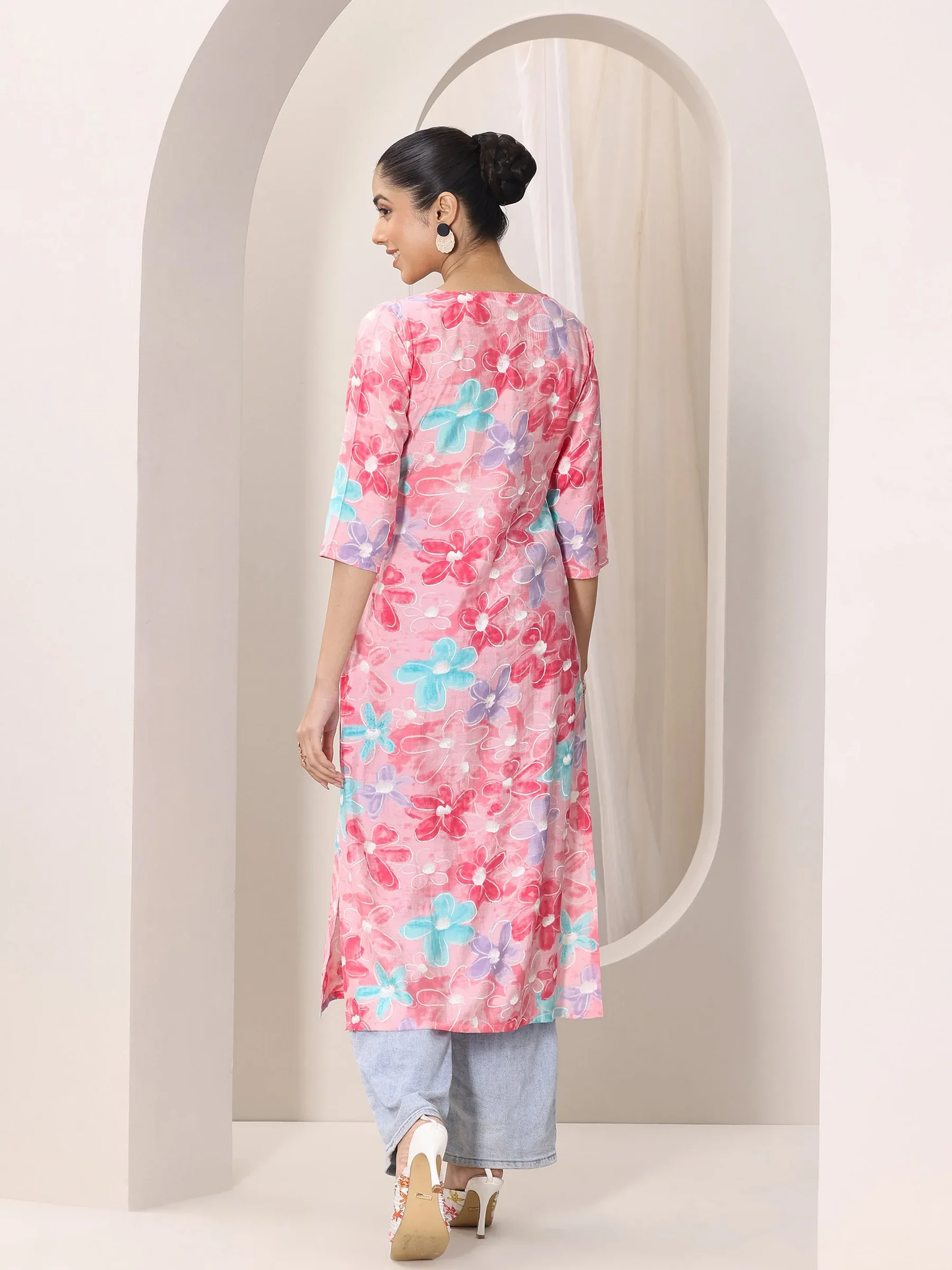 Pink Printed Silk Blend Straight Kurta
